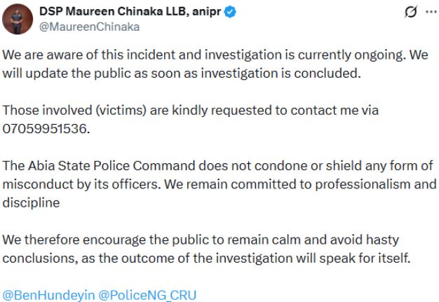 Also reacting, the spokesperson of the Abia state police command, DSP Maureen Chinaka, wrote: ‘’We are aware of this incident and investigation is currently ongoing. We will update the public as soon as investigation is concluded.