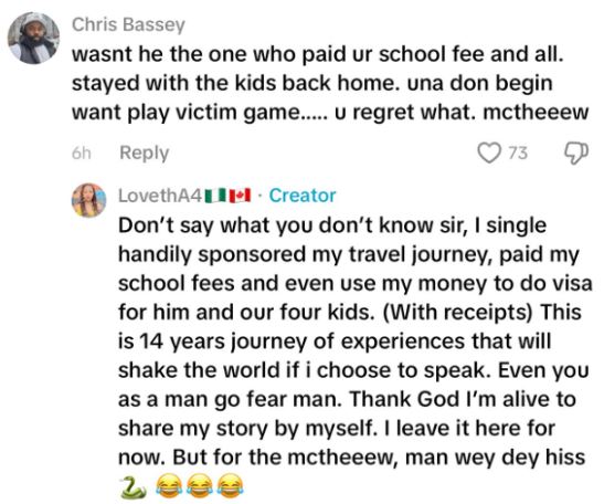 Responding to a follower who suggested that her husband paid her school fees, Loveth revealed that she singlehandedly sponsored her relocation to Canada and paid her school fees.