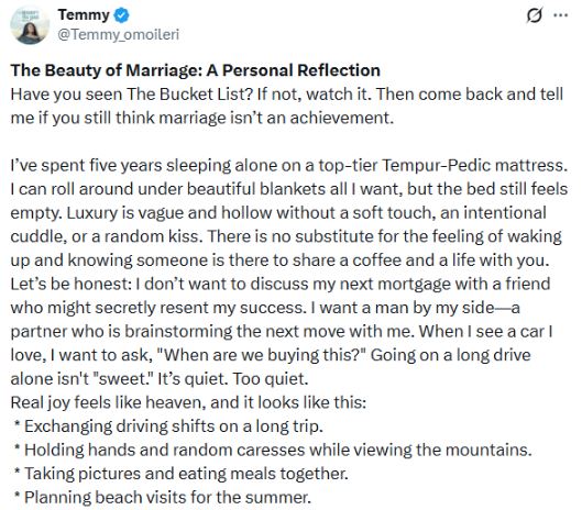 "Let’s be honest: I don’t want to discuss my next mortgage with a friend who might secretly resent my success. I want a man by my side—a partner who is brainstorming the next move with me. When I see a car I love, I want to ask, "When are we buying this?" Going on a long drive alone isn't "sweet." It’s quiet. Too quiet. Real joy feels like heaven, and it looks like this: * Exchanging driving shifts on a long trip. * Holding hands and random caresses while viewing the mountains. * Taking pictures and eating meals together. * Planning beach visits for the summer. We all feel the void of loneliness, yet we pretend we don't. Stop living in a delusional state.