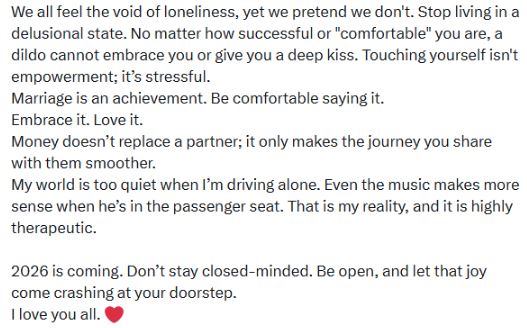 “My world is too quiet when I’m driving alone. Even the music makes more sense when he’s in the passenger seat. That is my reality, and it is highly therapeutic. 2026 is coming. Don’t stay closed-minded. Be open, and let that joy come crashing at your doorstep. I love you all.”
