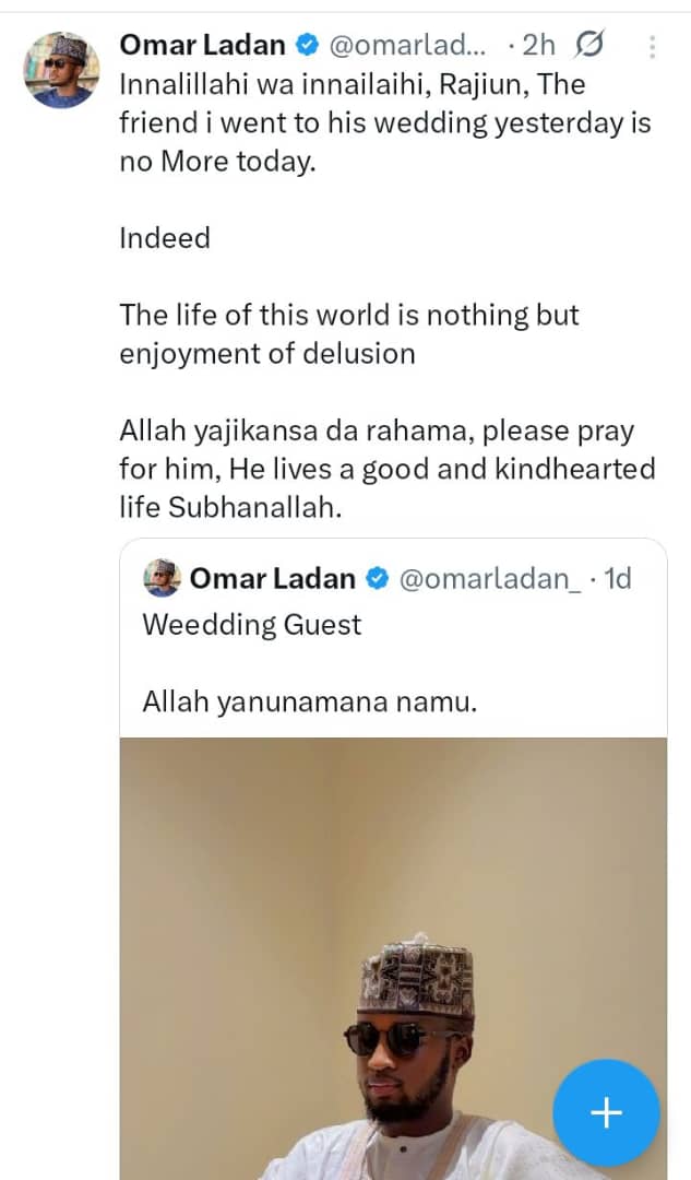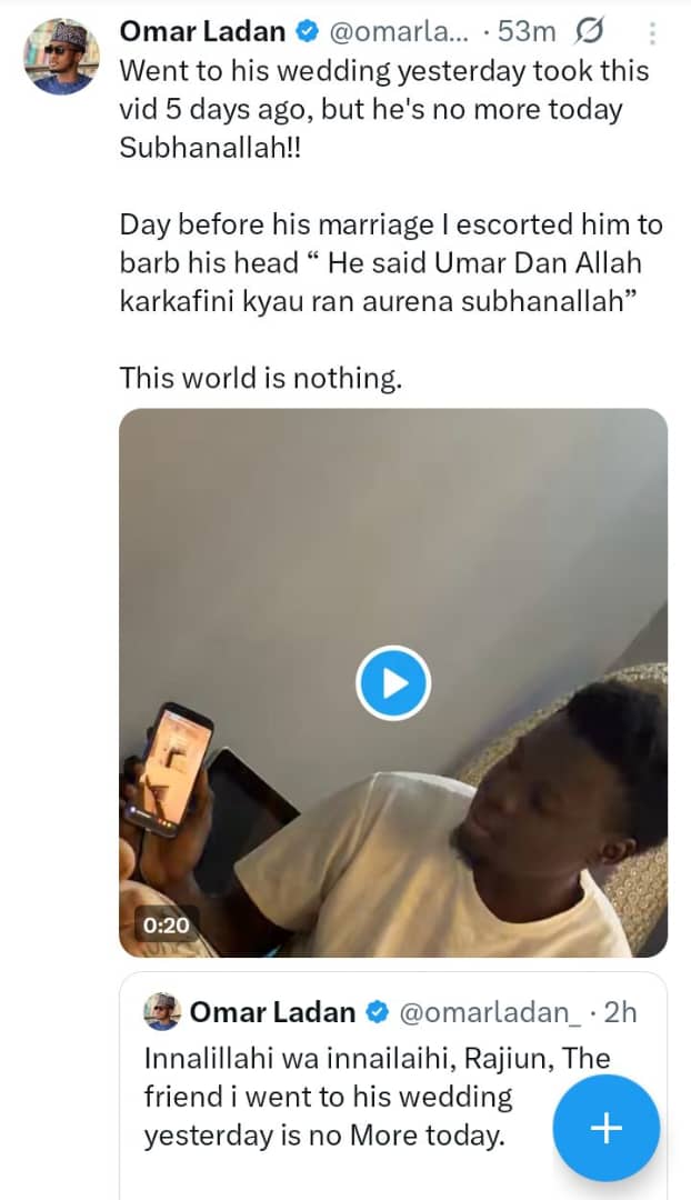 He then shared a video of the deceased taken shortly before his wedding and added: "Went to his wedding yesterday took this vid 5 days ago, but he's no more today. Subhanallah!!