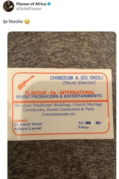 Nigerian singer and music icon Flavour has offered fans a fascinating glimpse into his journey to stardom by sharing a business card from his pre-fame days.