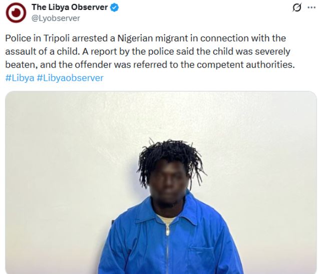 Police have arrested a Nigerian migrant suspected of ass@ulting a child in Tripoli, Libya.