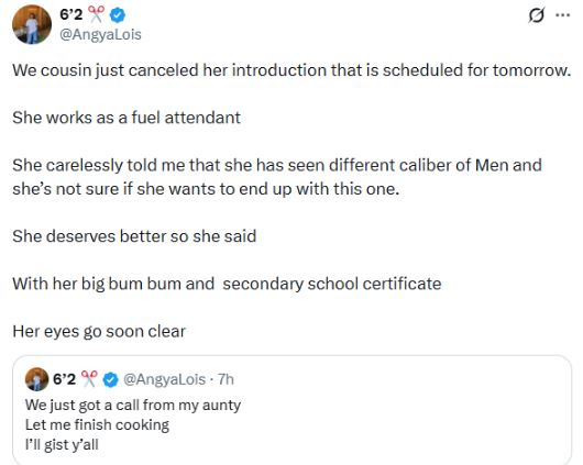 AngyaLois, a Nigerian woman, has revealed that her cousin, a fuel attendant, canceled her marriage introduction just a day before the ceremony.