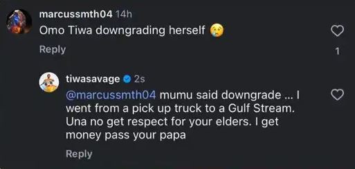 Tiwasavage replied: @marcussmth04 mumu said downgrade … I went from a pick up truck to a Gulf Stream. Una no get respect for your elders. I get money pass your papa