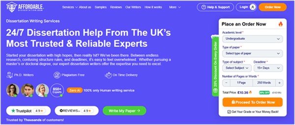 Affordable Dissertation UK is another trusted marketing dissertation writing help service, popular for delivering research-based theses at affordable rates. Students choose this platform again and again for their custom and fully formatted dissertations. The key attraction of this dissertation writing company is that it gives customers the flexibility to choose their own writer and communicate with them at any time.