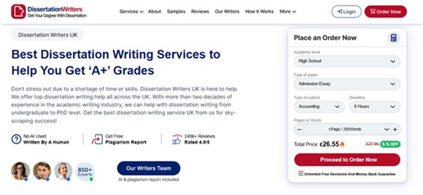 We placed Affordable Dissertation UK at the second number because of its transparent pricing policies and unlimited free revisions. Dissertation Writers UK stands out due to the expert data analysis support, fast delivery, and money-back guarantee. If you need professional dissertation assistance, you can choose any company that matches your academic needs.