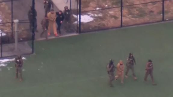 Bound in handcuffs and sporting beige clothing with orange trainers, Maduro was filmed from a news helicopter being led from the vehicle into an SUV at dusk.