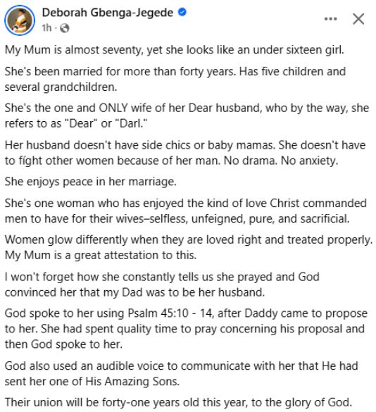 “My Mum is almost seventy, yet she looks like an under sixteen girl. She's been married for more than forty years. Has five children and several grandchildren,” she wrote in a Facebook post on Wednesday.
