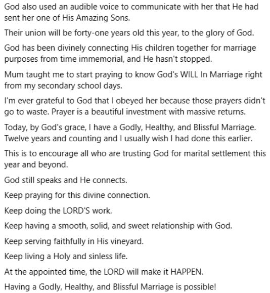 Mum taught me to start praying to know God's WILL In Marriage right from my secondary school days.