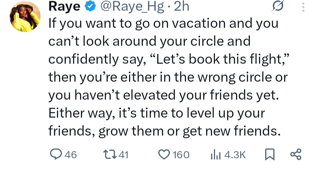 She wrote on X: "If you want to go on vacation and you can’t look around your circle and confidently say, “Let’s book this flight,” then you’re either in the wrong circle or you haven’t elevated your friends yet.