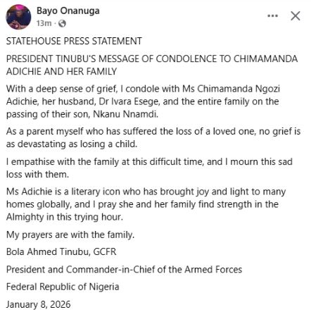 President Bola Tinubu has expressed his condolences to acclaimed Nigerian author Chimamanda Ngozi Adichie and her husband, Dr. Ivara Esege, following the tragic death of their son, Nkanu Nnamdi.