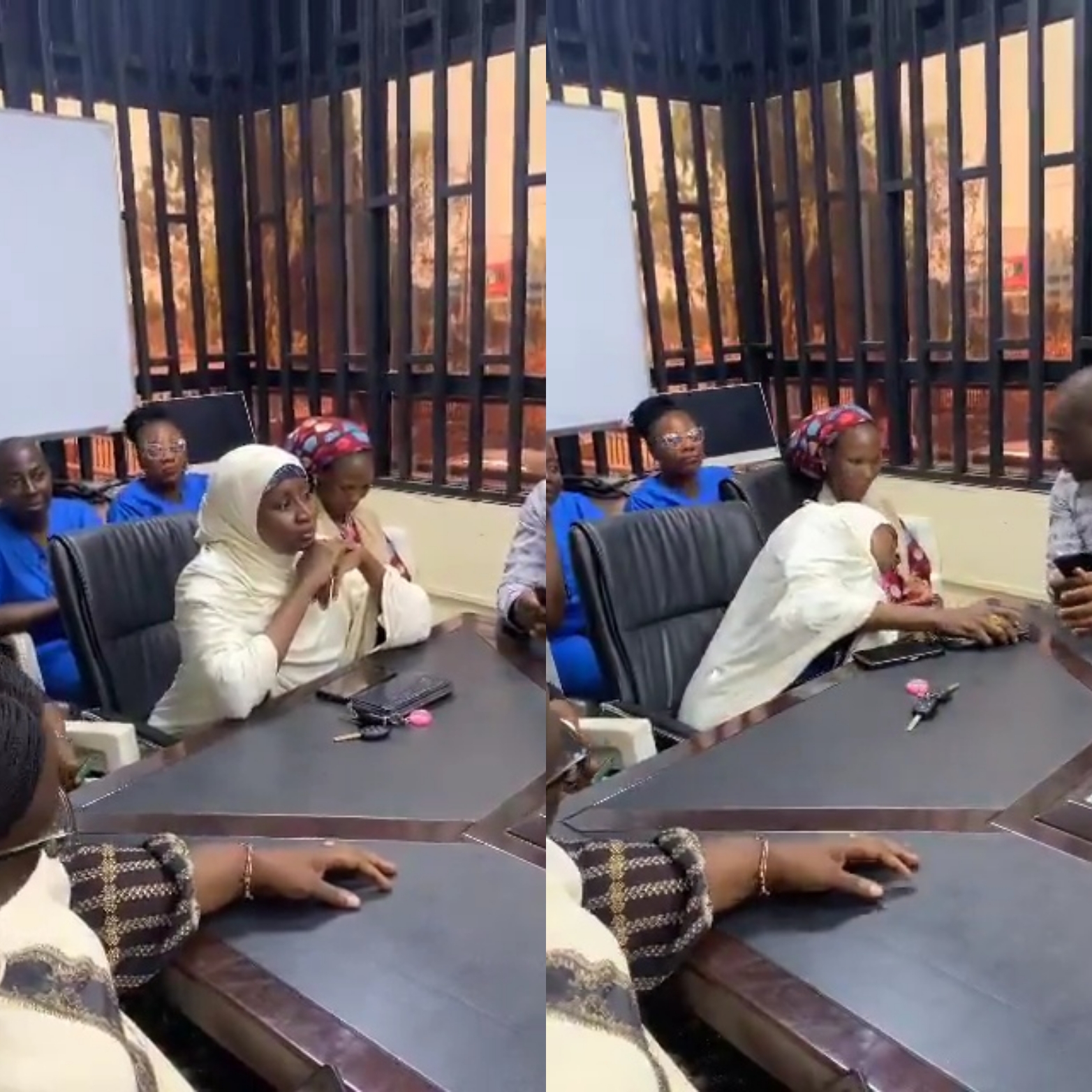 All of a sudden, the woman keeled over to one side, alarming her colleagues who quickly reached out to check on her.