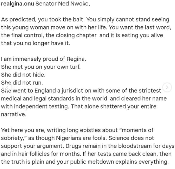 Popular Nigerian actress, Gina Onuoha has fired back at Senator Ned Nwoko following his response to the drug test Regina Daniels reportedly took overseas.