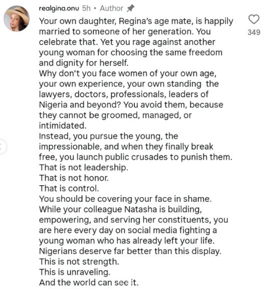 Gina further accused the senator of hypocrisy, pointing out that his own daughter, Regina’s age mate, is happily married to someone her generation, while Regina is being publicly attacked for choosing her freedom.