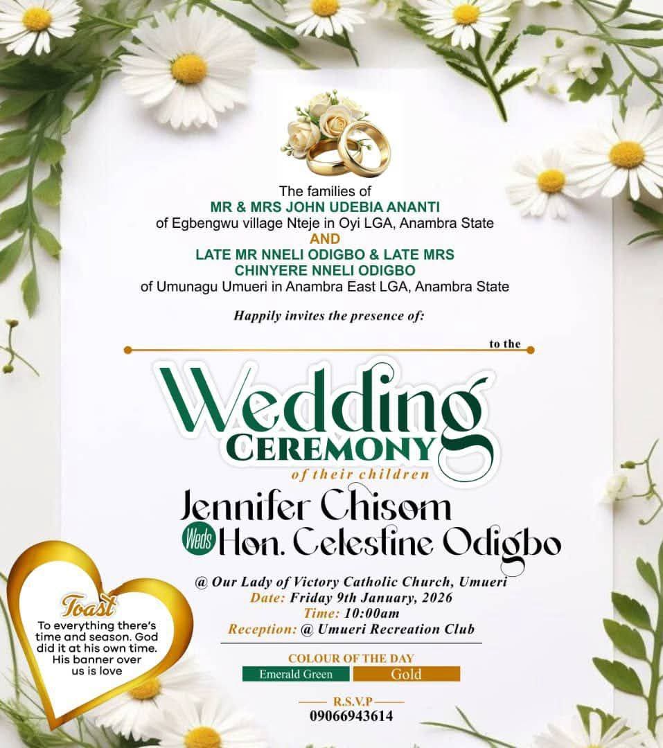 The lady, Jennifer Chisom Ananti, from Anambra State, was set to wed Celestine Odigbo, also from Anambra State, on January 9.