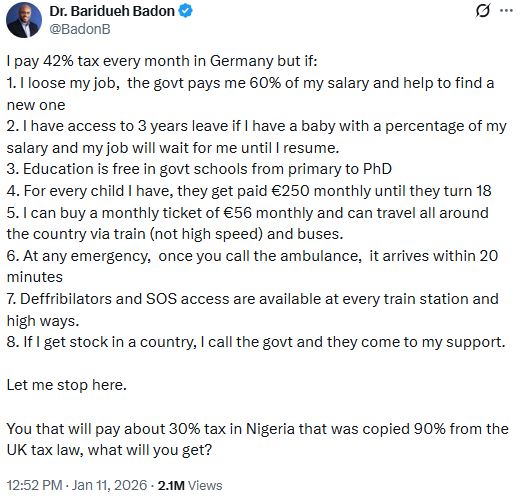 A Nigerian medical doctor, Baridueh Badon, has taken to social media to highlight the benefits he enjoys after paying 42% tax to the German government.