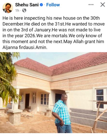Senator Shehu Sani shared a photo of the man inspecting the house just hours before his demise.