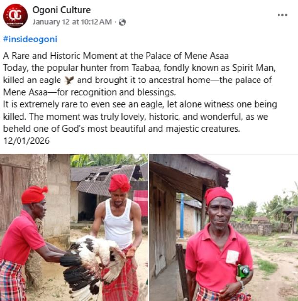 According to a Facebook post, in Ogoni tradition, the eagle is a powerful symbol of strength, royalty, and honour. Spotting one is rare, and k!lling one is even rarer.