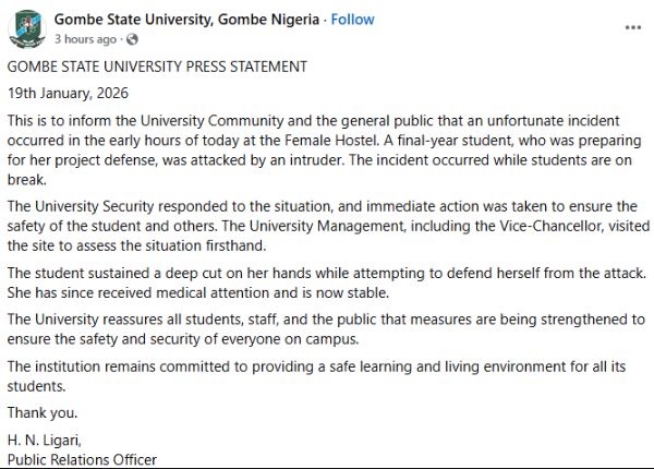 “This is to inform the University Community and the general public that an unfortunate incident occurred in the early hours of today at the Female Hostel. A final-year student, who was preparing for her project defense, was attacked by an intruder. The incident occurred while students are on break,” the statement read.