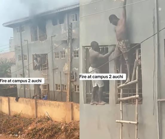 A video capturing the terrifying moment students of a tertiary institution in Edo State leapt from a two-storey building balcony to escape a fire at a building behind Farnet Campus 2, Auchi, has gone viral on social media.
