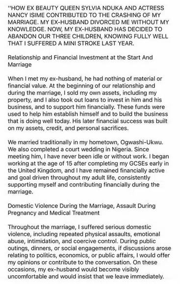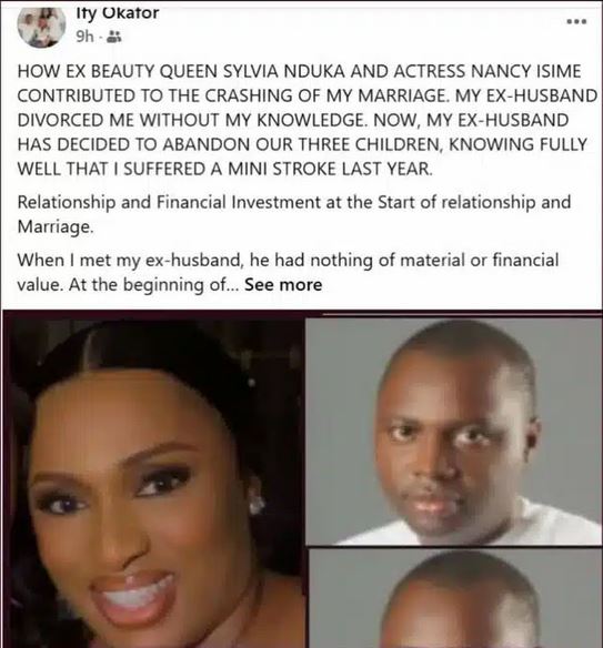 Ify Okafor, a Nigerian woman residing in the United Kingdom, has accused actress Nancy Isime and former beauty queen Sylvia Nduka of allegedly contributing to the collapse of her marriage to businessman Chinedu Nwobodo, owner of Circa Lagos.