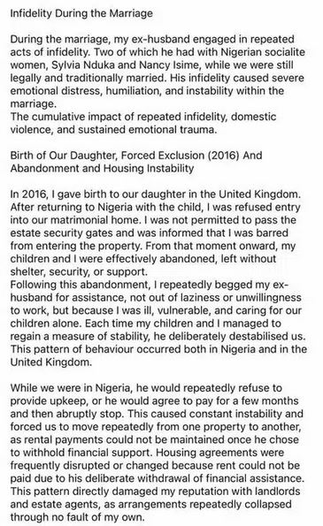 According to her account, the alleged relationships with Nancy Isime and Sylvia Nduka brought deep pain, shame, and unrest into her home.
