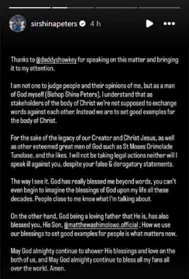 While appreciating his junior colleague, Daddy Showkey, for bringing his attention to Ashimolowo’s claim concerning him, Shina Peters, who is now also a pastor, noted that he would not take legal action because of his dedication to the body of Christ.