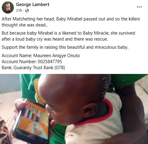 George Lambert, a community leader, who visited Mirabel in the hospital said that the baby survived because the attackers thought she d!ed after they hit her with a machete on the head and she lost consciousness.