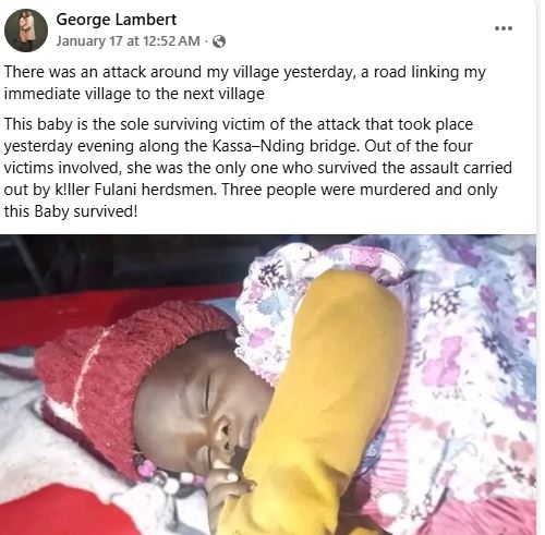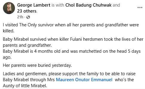 A four-month-old baby, Mirabels, who survived an attack that k!lled her parents and grandfather in Plateau State, is now making a remarkable recovery.