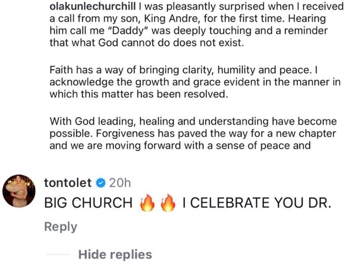 Adding to the surprise, Tonto Dikeh herself engaged with the post, leaving a heartfelt comment that praised Churchill and the progress they have made as co-parents. The interaction drew widespread attention, with fans lauding the former couple for prioritizing their son’s well-being over past disagreements.