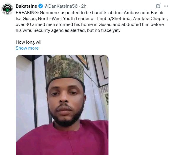 Suspected bandits have kidnapped Ambassador Bashir Isa Gusau, the North-West Youth Leader of the Tinubu/Shettima Campaign Organisation in Zamfara State, during a fresh attack in the state capital, Gusau.