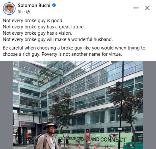 Solomon Buchi, the social media commentator, has sparked conversation with his recent thoughts on relationships and financial status.