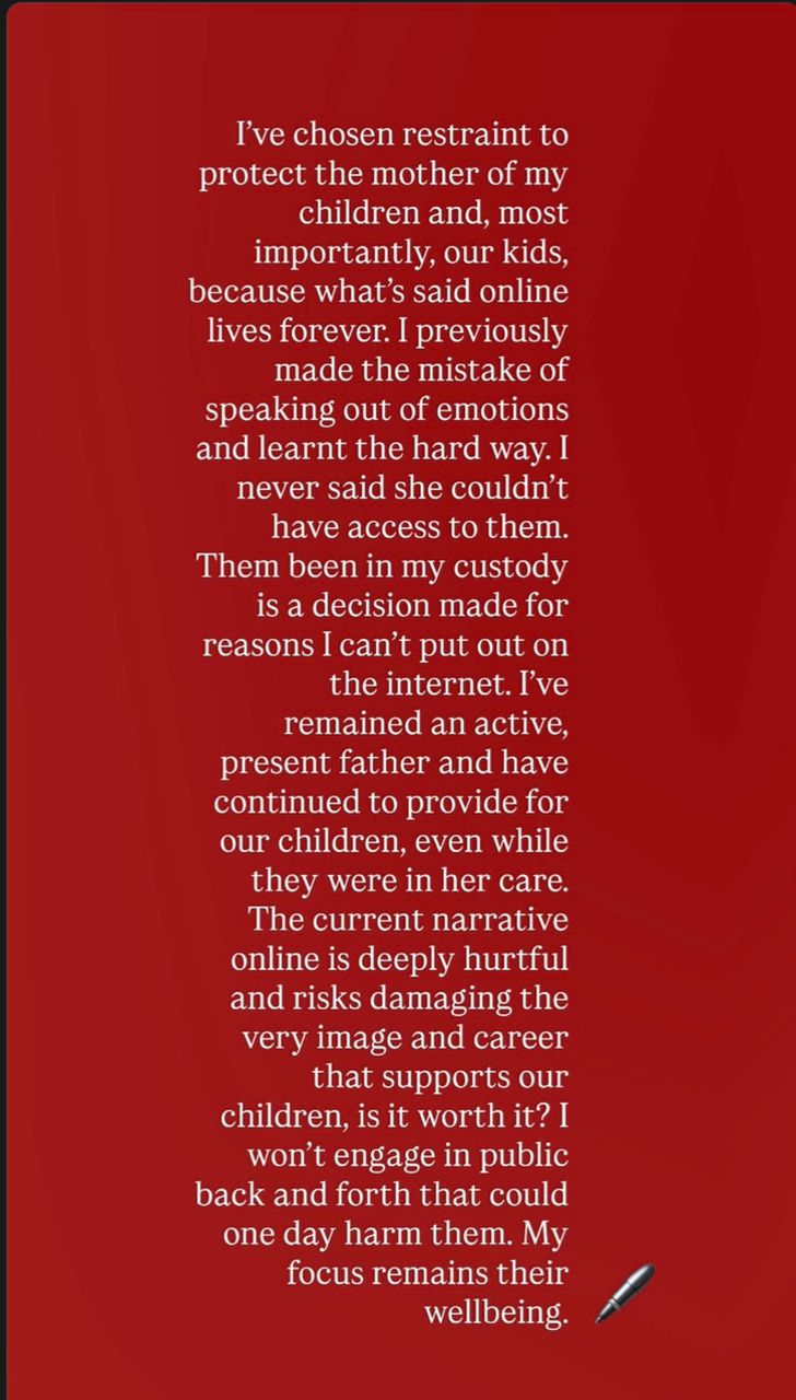 In response, Harrysong, in a post on his Instagram story on Friday, said his decision to remain silent is aimed at protecting his kids and their mother, because whatever is said online remains forever.