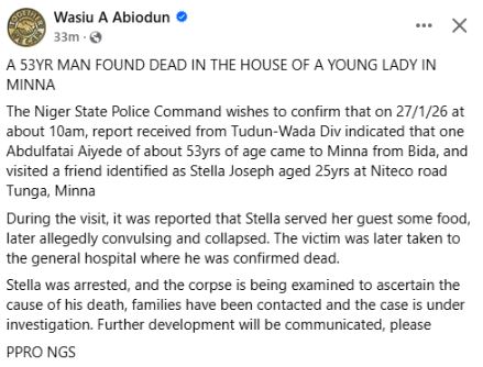 “The Niger State Police Command wishes to confirm that on 27/1/26 at about 10am, report received from Tudun-Wada Div indicated that one Abdulfatai Aiyede of about 53yrs of age came to Minna from Bida, and visited a friend identified as Stella Joseph aged 25yrs at Niteco road Tunga, Minna,” the statement read.