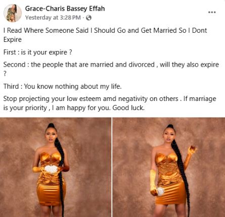Grace Charis Bassey Effah, the Nigerian actress, who was formerly known as Belinda Effa, has fired back at those shaming her for being single, rejecting claims that she must marry to avoid “expiring.”