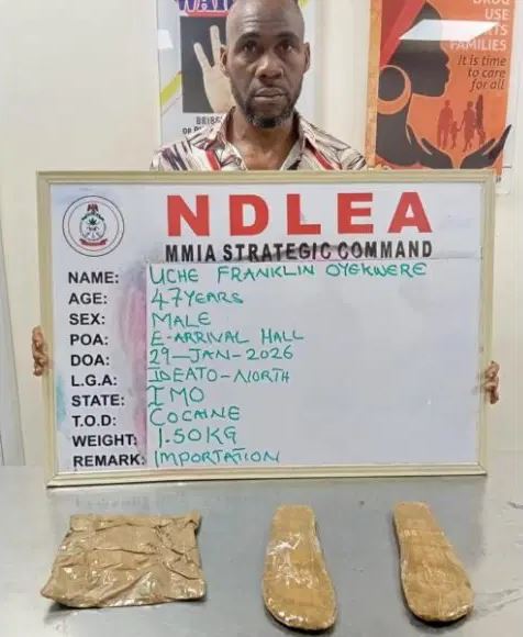 The NDLEA said Onyekwere was arrested on Thursday, January 29, 2026, during the inward clearance of South African Airways passengers arriving from Brazil via Johannesburg, following processed intelligence.