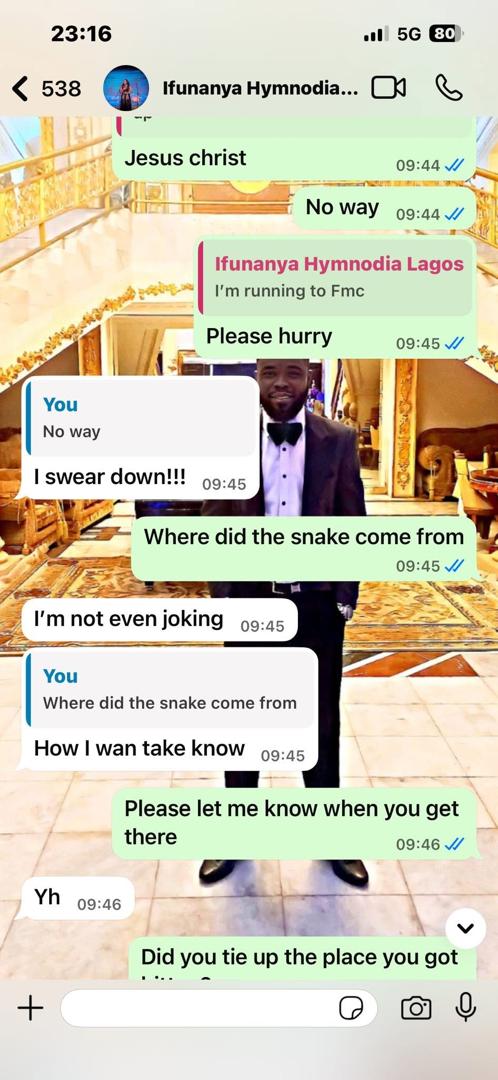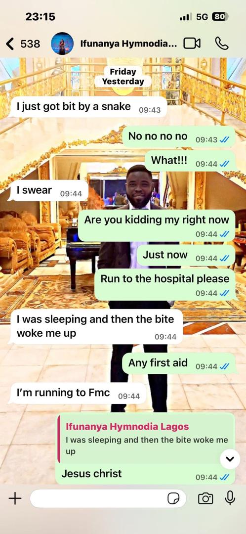 In a post shared on his Facebook page, Paschal recounted how they met seven years ago and remained friends. He revealed that Ifunanya d!ed in his arms and also released a screenshot of the message he received from her after the snake bite.