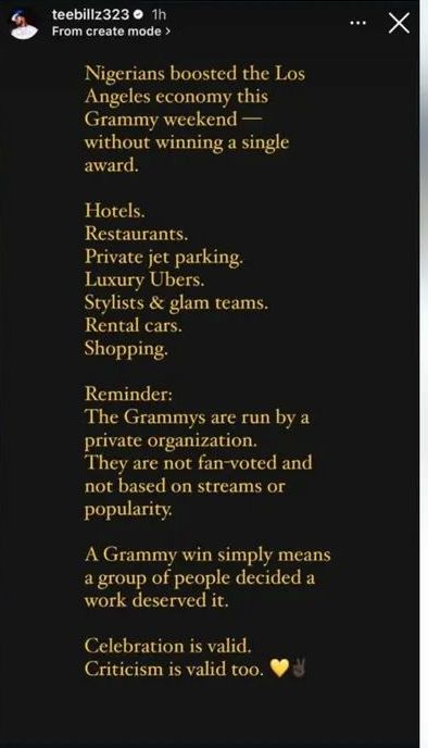 Teebillz, the Nigerian talent manager, has joined the 2026 Grammys conversation, highlighting that Nigerians made a significant impact in Los Angeles, even without winning an award.