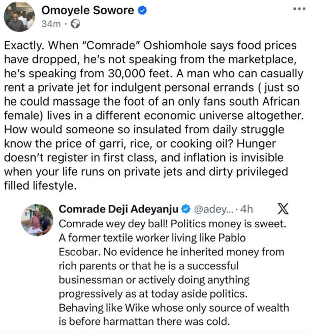 Adeyanju in his reaction which he shared on his X handle, wrote: ‘’Comrade wey dey ball! Politics money is sweet. A former textile worker living like Pablo Escobar.