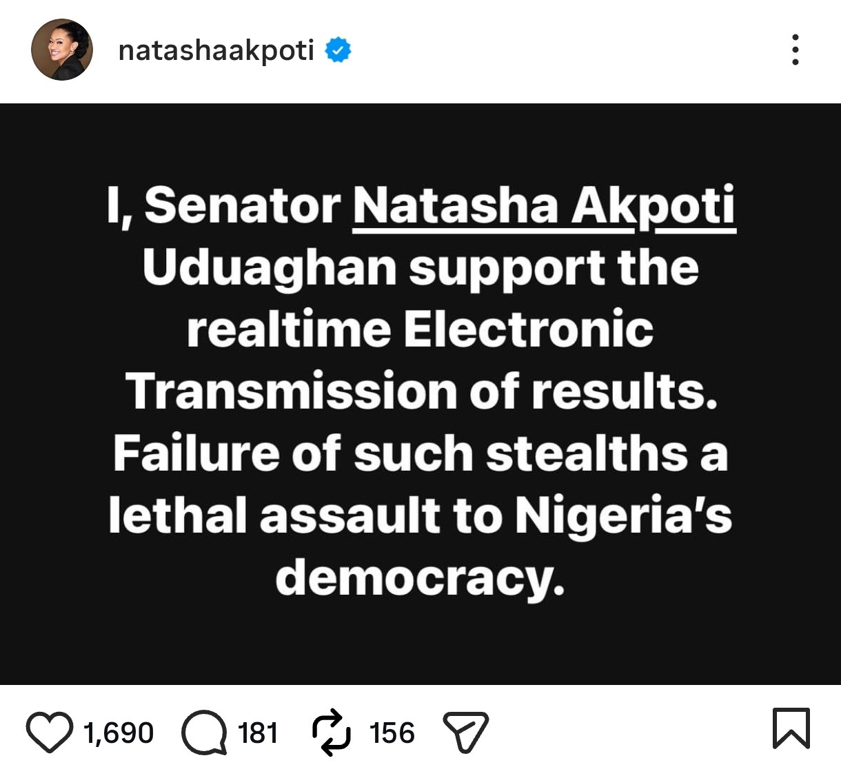 She wrote, “I, Senator Natasha Akpoti Uduaghan supports the real-time Electronic Transmission of results.
