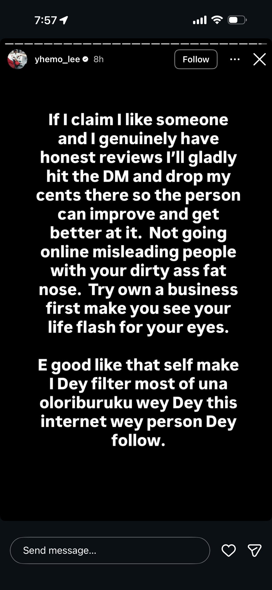 He also claimed that the brand’s marketing team had previously reached out to Opeyemi for a launch review, but the critic allegedly demanded ₦6 million. Yhemolee suggested that the negative review only came after the business started doing well without him.