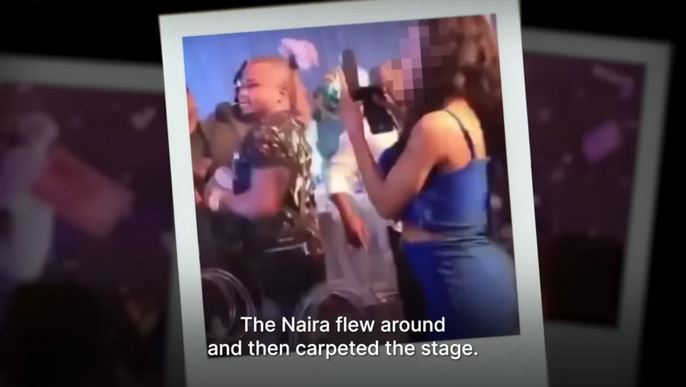 One of the videos on his Instagram page shows him throwing bundles of naira during a performance by Davido, a Nigerian music star, in Asaba, Delta state capital.