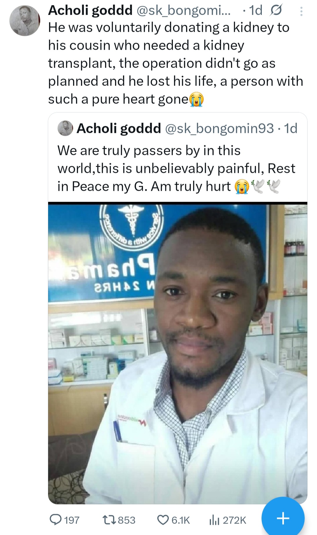 A tragic incident has left many in mourning after a pharmacist lost his life while attempting to save his cousin through a kidney donation.