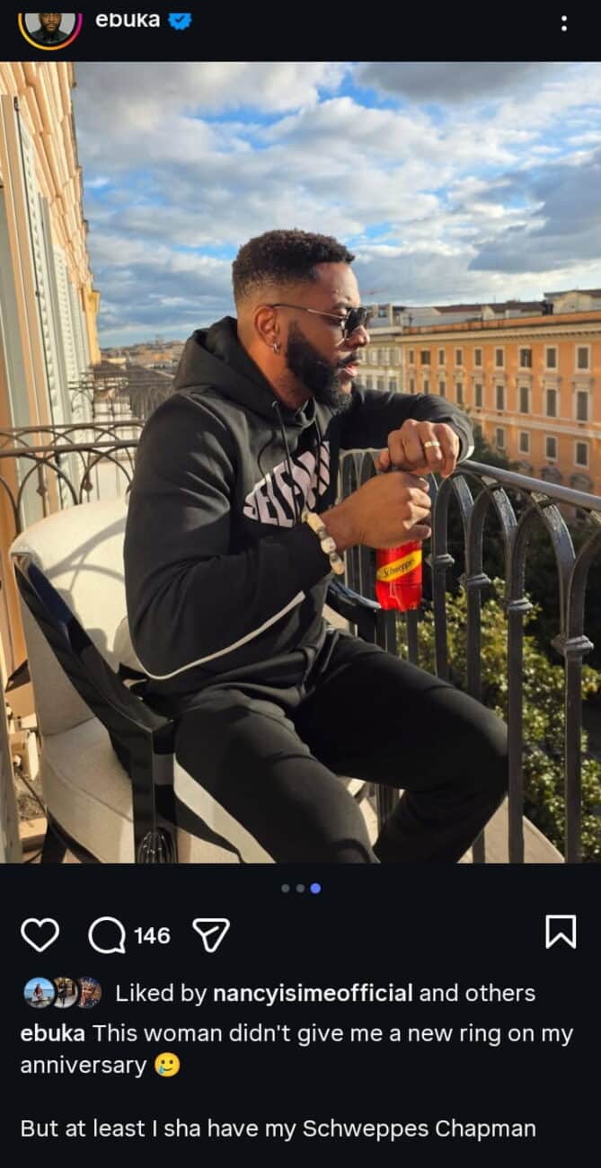 However, in his signature playful manner, Ebuka later took to social media to jokingly “call out” his wife for not reciprocating the grand gesture. Sharing photos of himself relaxing with a bottle of Schweppes, he humorously lamented that she did not present him with a new ring in return.