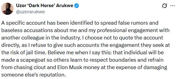 He wrote, “A specific account has been identified to spread false rumors and baseless accusations about me and my professional engagement with another colleague in the industry. I choose not to quote the account directly, as I refuse to give such accounts the engagement they seek at the risk of jail time.