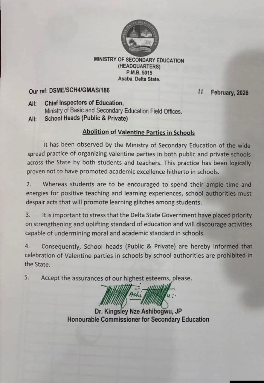 The Delta State Government has prohibited the observance of Valentine’s Day in all public and private secondary schools throughout the state.
