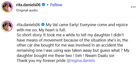 Nigerian star actress, Regina Daniel's mother, Rita Daniels, is thrilled after her daughter gifted her two cars for Valentine's Day.