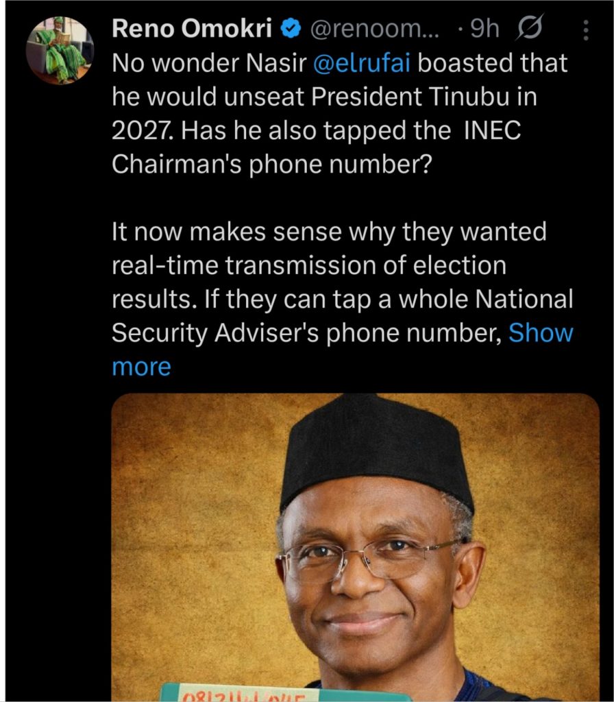 “No wonder Nasir @elrufai boasted that he would unseat President Tinubu in 2027. Has he also tapped the INEC Chairman’s phone number?