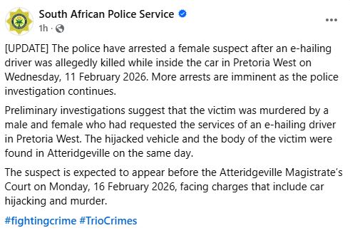 The woman is expected to appear before the Atteridgeville Magistrate’s Court on Monday, February 16, 2026. She is facing charges of car hijacking and m8rder.